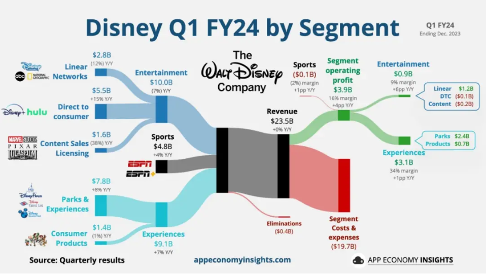 另外Disney+Hotstar终于止住下行趋势,从前一季的3760万微涨至3830万,再加上Hulu按季新增120万用户,让迪士尼的流媒体整体维持平盘。这也体现在直接面向消费者板块的财务指标上:该季度总营收从48.22亿升至55.46亿美元,同比涨幅达到15%;亏损额则从9.84亿压缩至1.38亿美元,优化幅度更接近86%。若与前个季度相比,该板块的净亏损便减少了近3亿美元,向2024财年内盈利的目标又迈进一大步。