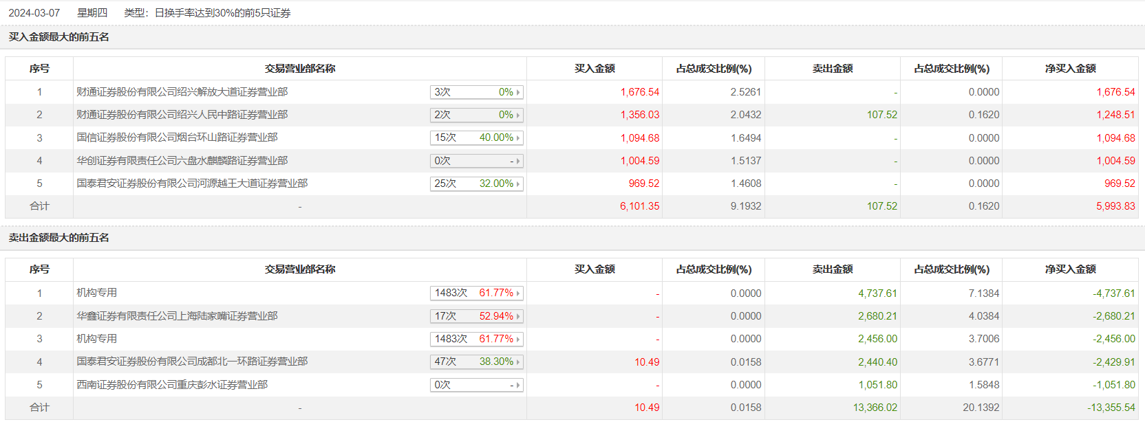 具体来看,机构合计净卖出7193.61万元。此外,财通证券绍兴解放大道证券营业部、财通证券绍兴人民中路证券营业部分别买入1676.54万元、1356.03万元;华鑫证券上海陆家嘴证券营业部、国泰君安证券成都北一环路证券营业部分别卖出2680.21万元、2440.40万元。