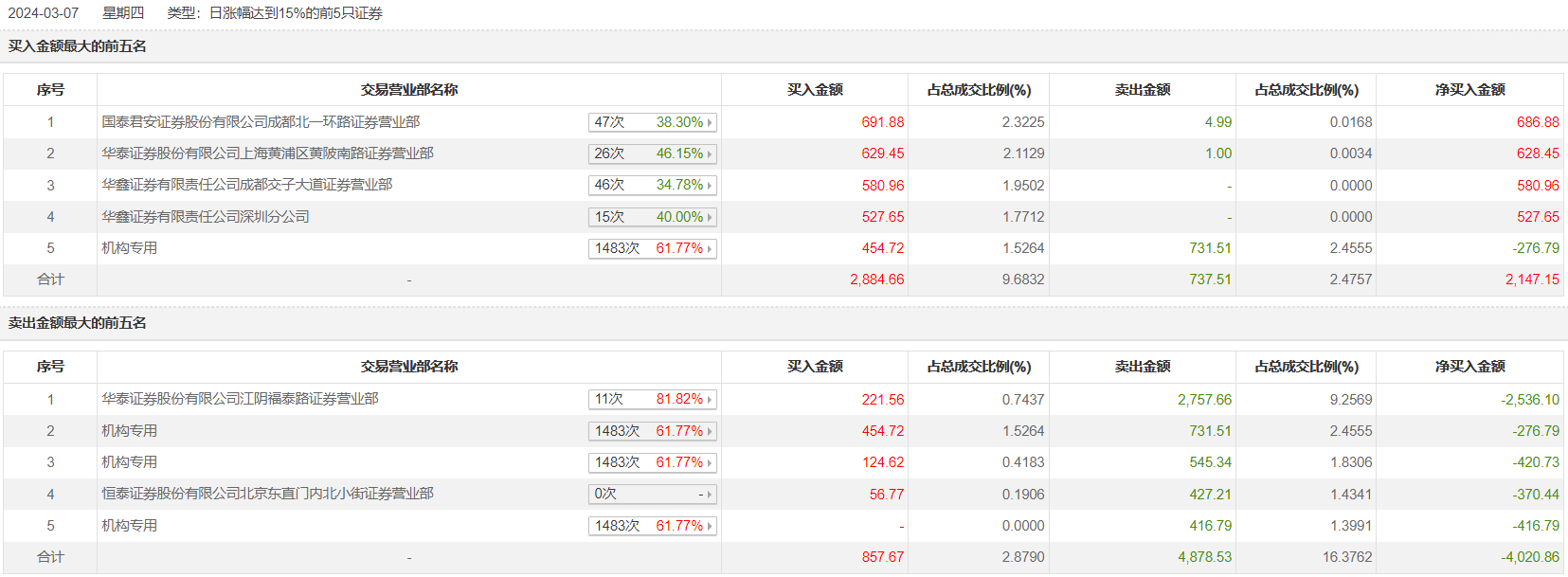 具体来看,机构买入579.34万元,卖出1693.65万元,合计净卖出1114.31万元。此外,国泰君安证券成都北一环路证券营业部、华泰证券上海黄浦区黄陂南路证券营业部分别买入691.88万元、629.45万元;华泰证券江阴福泰路证券营业部、恒泰证券北京东直门内北小街证券营业部分别卖出2757.66万元、427.21万元。