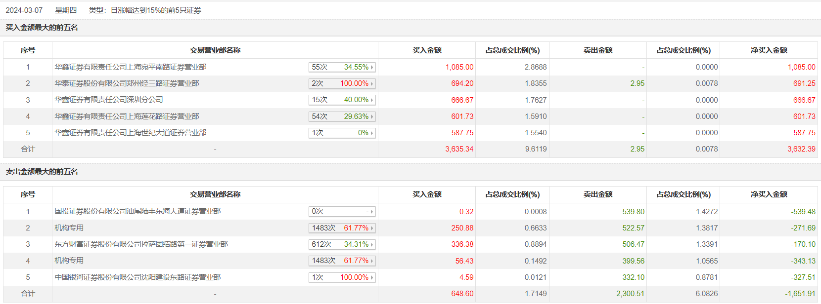 威马农机3月7日涨停,龙虎榜数据显示,上榜营业部席位全天成交6587.4万元,占当日总成交金额比例为17.42%。其中,买入金额为4283.94万元,卖出金额为2303.46万元,合计净买入1980.48万元。