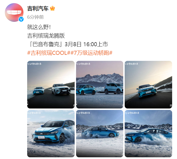 吉利汽车微博3月7日消息,吉利缤瑞龙腾版「巴音布鲁克」3月8日16:00上市。