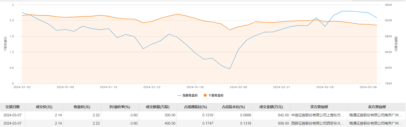 苏宁环球3月7日大宗交易成交700万股,成交额1498万元,占当日总成交额的25.52%,成交价2.14元,较市场收盘价2.22元折价3.6%。