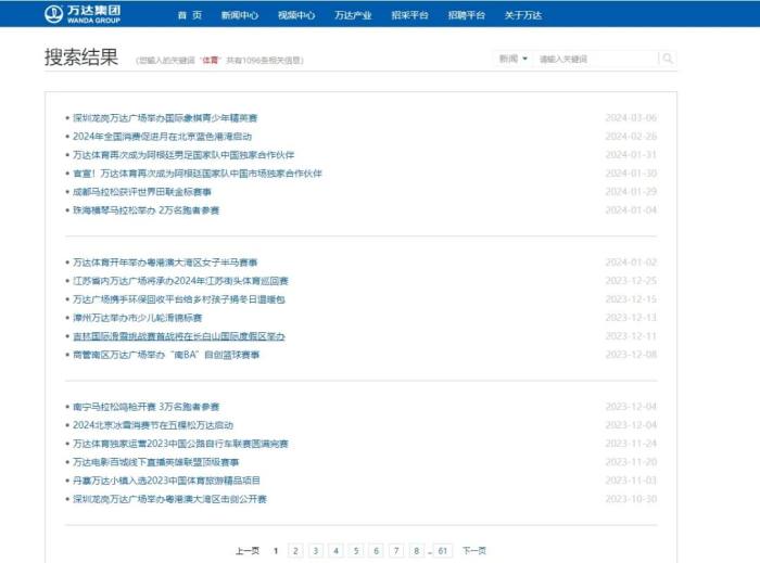 事实上,曾荣登过中国首富宝座的王健林,有一颗非常大的“野心”。靠地产发家的他,有过文旅梦,有过电影梦,自然也少不了体育梦。雷达财经在万达集团官网搜索关键词“体育”,可以搜寻到足足61页的关联结果。