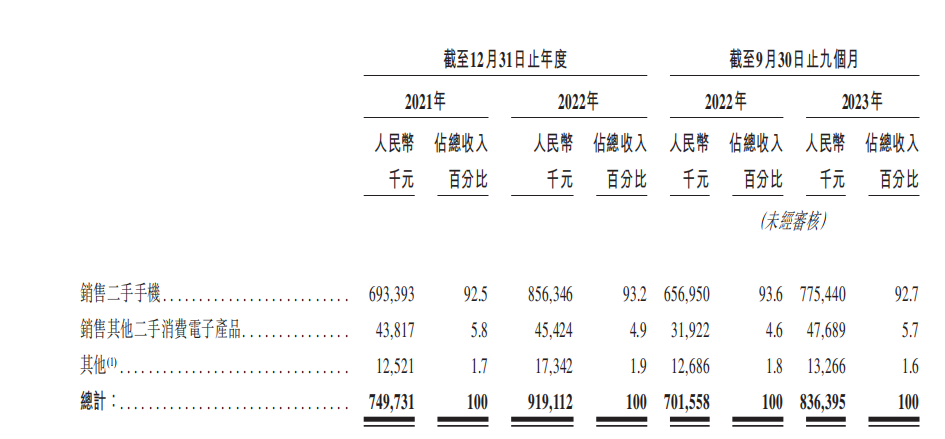 从收入来看,公司绝大部分收入来源于销售二手手机。数据显示,2022年闪回科技销售二手手机收入高达8.56亿元,占公司收入比例为93.2%。