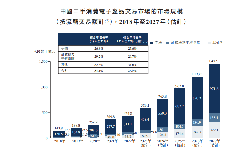 从行业来看,由于国内手机消费市场庞大,二手手机市场规模一直维持较高增速。弗若斯特沙利文数据显示,2018年至2023年,国内二手手机行业年复合增长率为26.8%。该研究机构还预测2023年至2027年,国内二手手机交易规模年复合增长率将高达25.6%。