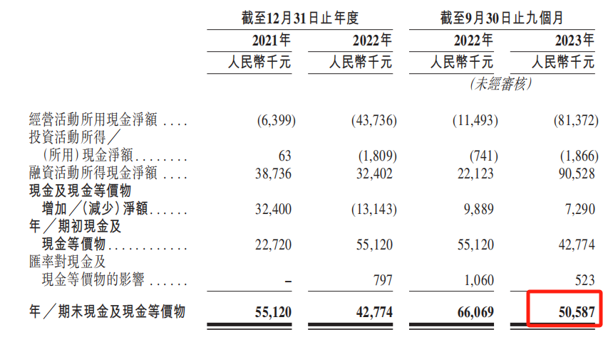 除持续亏损外,「子弹财经」还发现,闪回科技现金流并不充裕。截至2023年9月30日,闪回科技现金及现金等价物为5058.7万元。