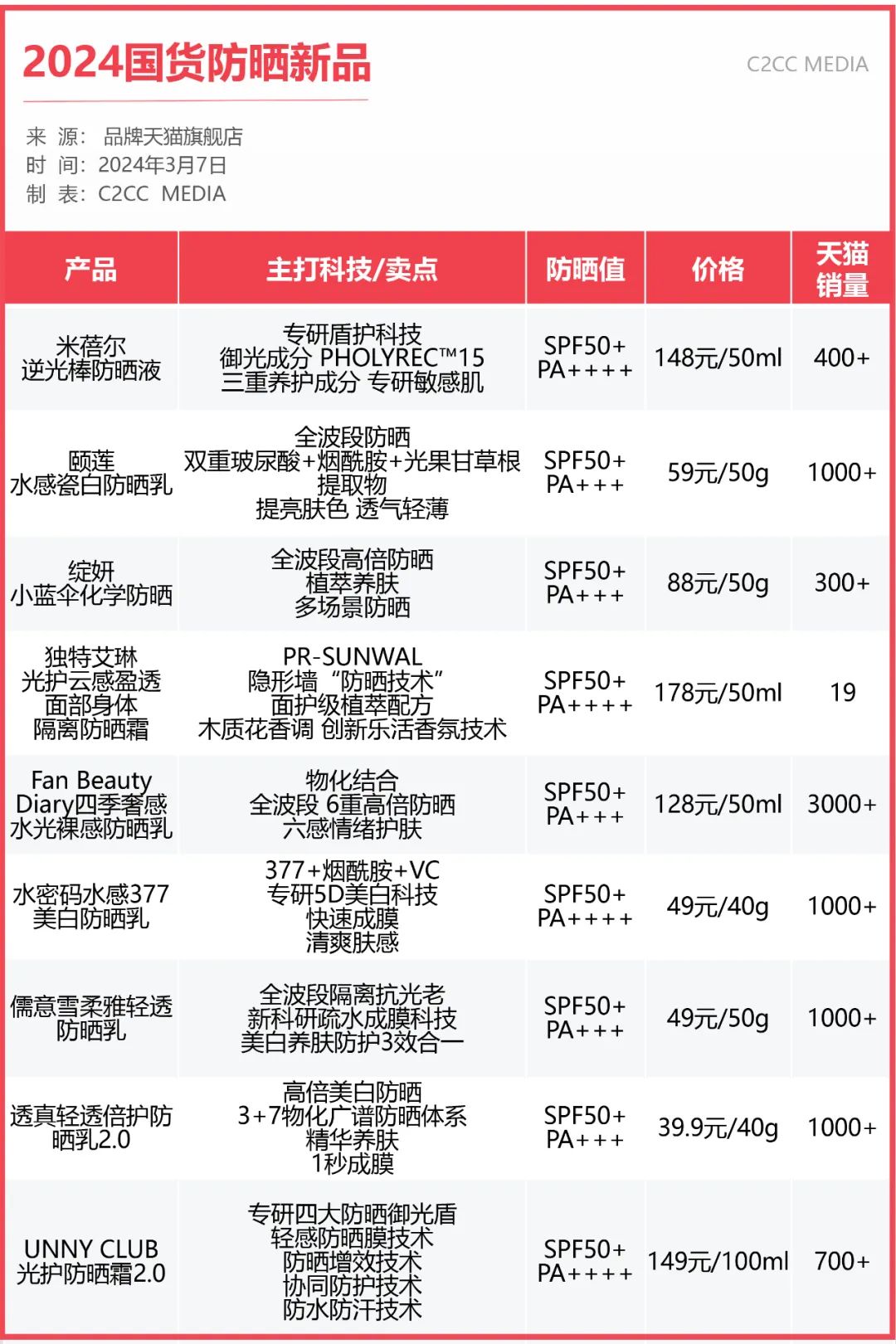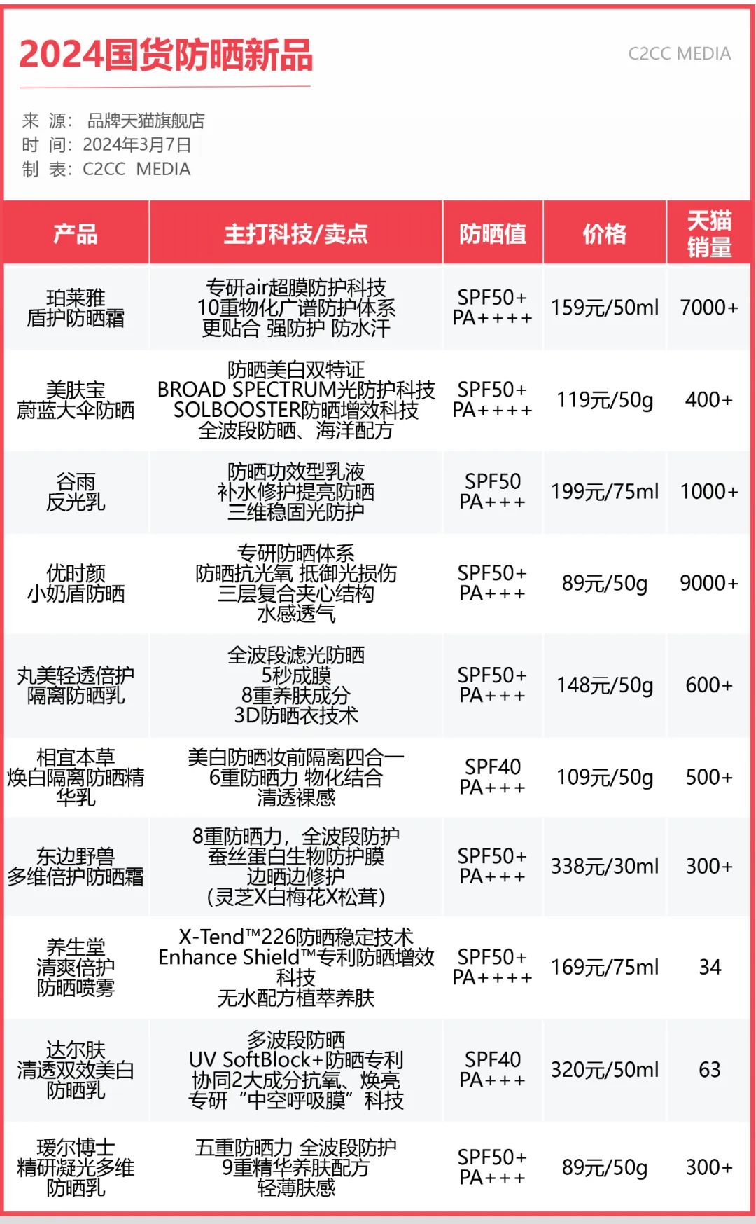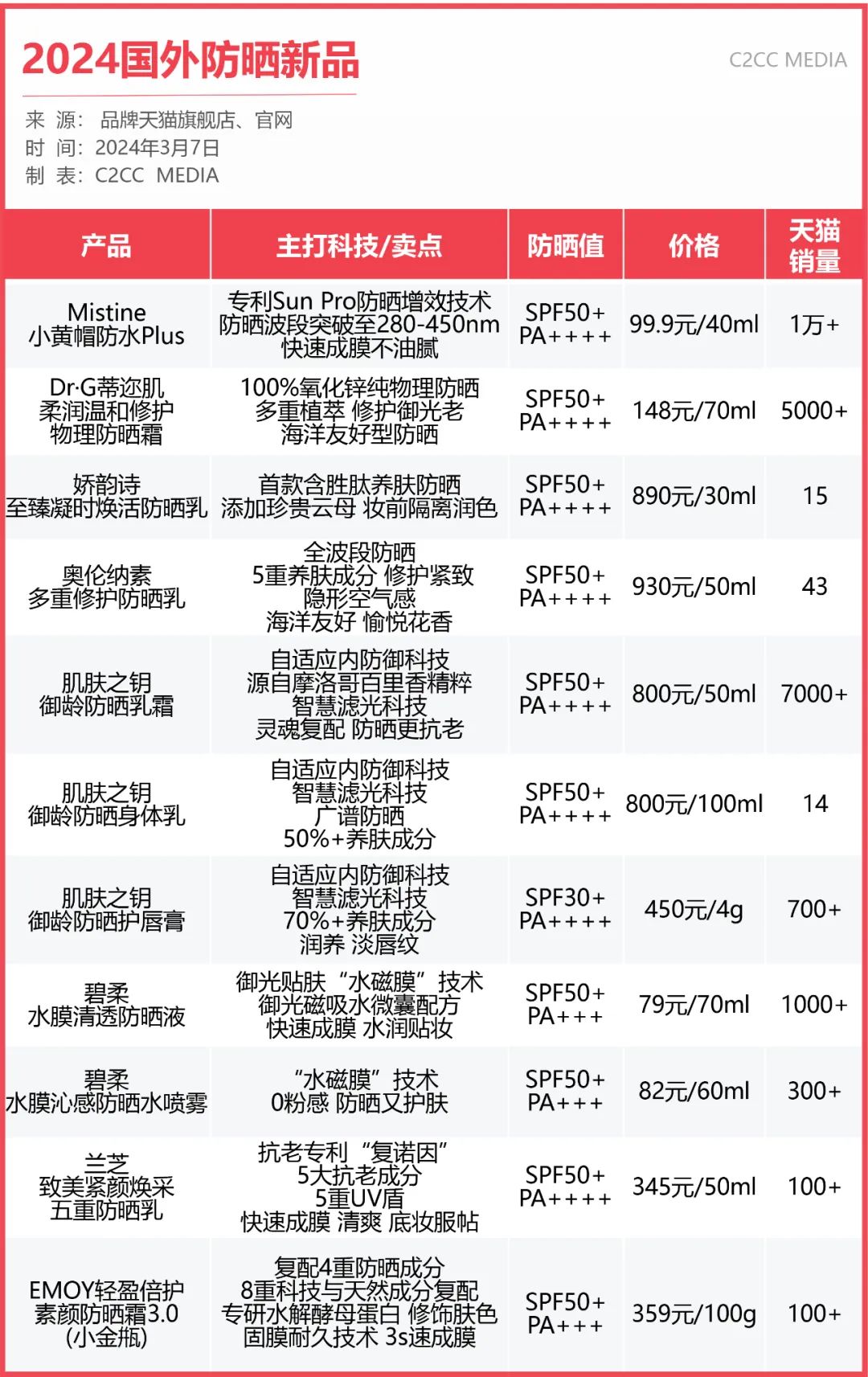 根据C2CC传媒X新妆不完全统计,自今年1月起,仅天猫平台有超30款重磅防晒新品上市。如美肤宝蔚蓝大伞防晒、珀莱雅盾护防晒霜、丸美滤光防晒、绽妍小蓝伞;同时,Mistine、娇韵诗、奥伦纳素、肌肤之钥等国际品牌也持续加强自家防晒产品线。新品价格带涵盖50元入门款到千元以上轻奢款,不乏技术创新、功效叠加、品类延伸等新卖点。