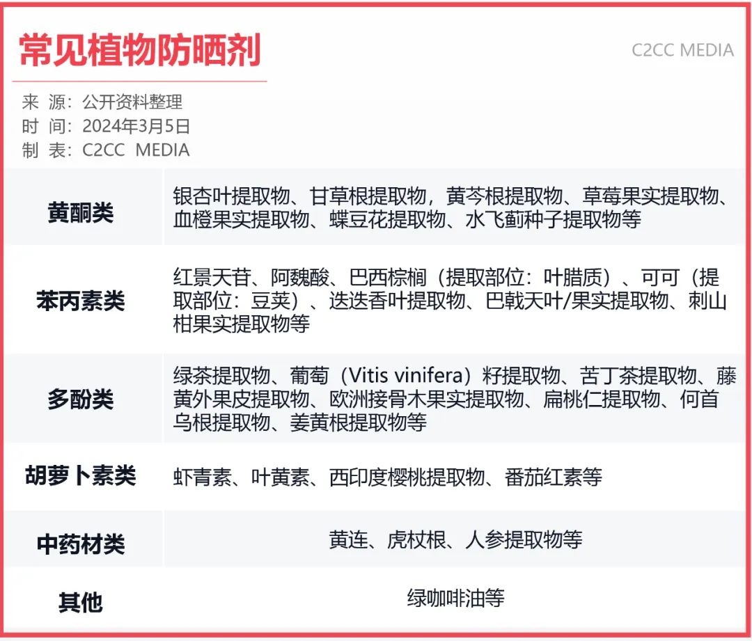 市场对防晒产品安全与温和的需求,还催生出植物类防晒剂——植物提取的、具有防晒作用的活性成分。相较于传统的化学防晒剂,植物防晒剂更安全、温和,不会引起皮肤过敏等问题,能够提供更全面的防护。