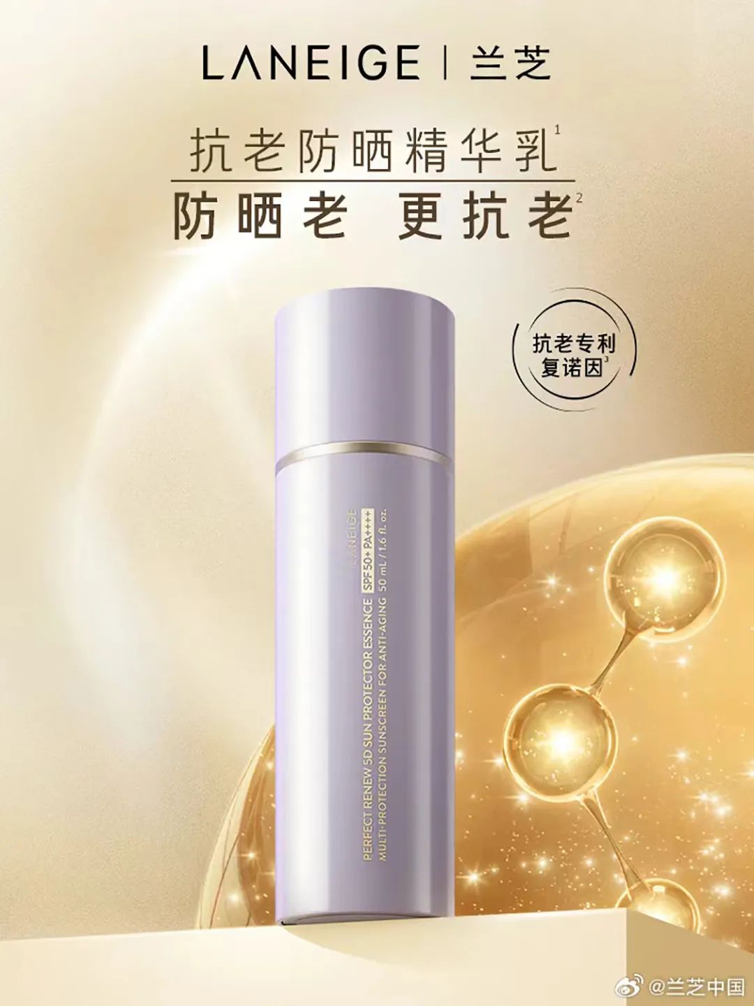 兰芝致美紧颜焕采五重防晒乳,5大抗老成分加持。添加独家抗老专利成分“复诺因”、修护肽以及3大肽等5大抗老成分。据了解,“复诺因”可以调节PDK1,从而调节皮肤角蛋白健康循环,在增加年轻细胞数量的同时,促成胶原纤维的增加。