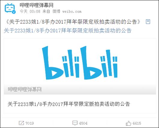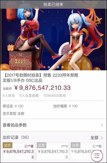 近日,哔哩哔哩弹幕网(简称B站)在拜年祭活动中推出限量版手办拍卖,与此次活动合作的平台方为淘宝网。拍卖会于1月23日晚7:30开始,第2017号2233娘手办拍了1个多小时,竞拍价也一路飙升,最终锁定在98亿元人民币。而出价最高者以“我弟弟瞎玩的”为由,拒绝支付竞拍款。