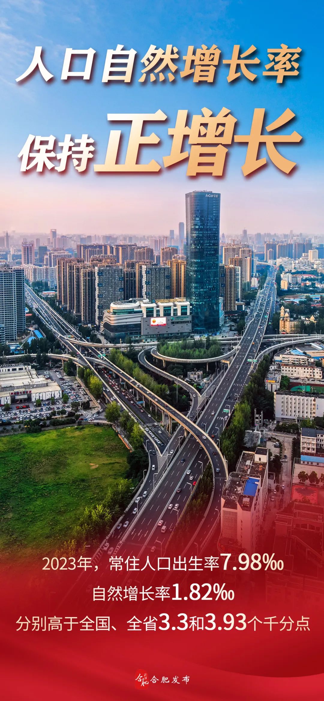人口自然增长率保持正增长。2023年,全市常住人口中,出生人口7.8万人,出生率7.98‰;死亡人口6万人,死亡率6.16‰;自然增长人口1.8万人,自然增长率1.82‰,继续保持正增长,分别高于全国、全省3.3和3.93个千分点,反映合肥人口结构相对年轻化。