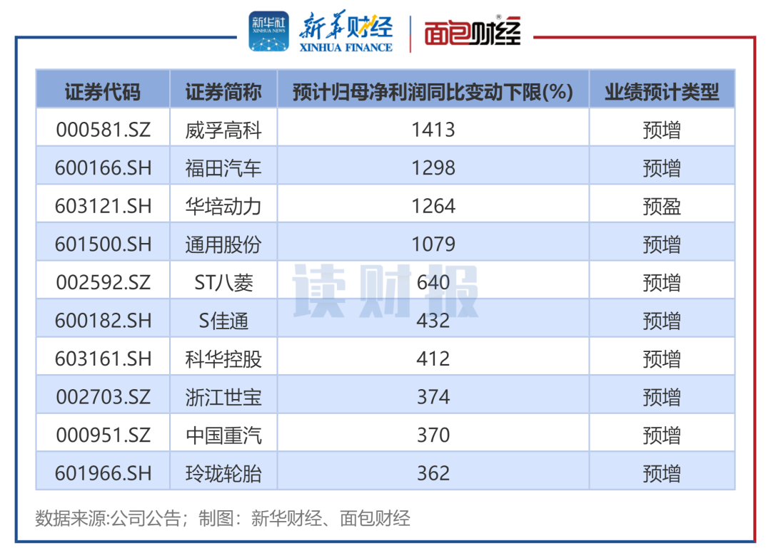 福田汽车、华培动力和通用股份的归母净利润同比涨幅位列第二至第四位,归母净利润同比增长下限均超过1000%。