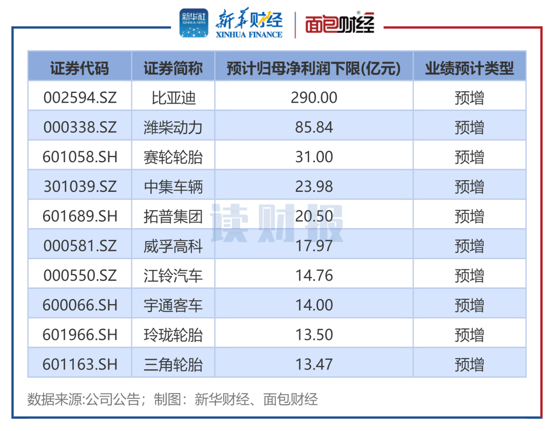 以预告归母净利润下限统计,14家公司预计归母净利润超过10亿元。其中,比亚迪的预告归母净利润下限为290亿元,位列第一;潍柴动力的预告归母净利润下限为85.84亿元,位列第二;赛轮轮胎、中集车辆、拓普集团的预告归母净利润均超20亿元。