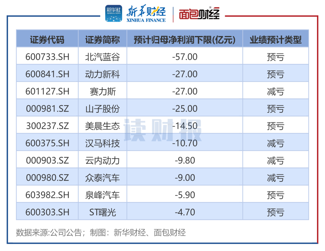 北汽蓝谷、动力新科、赛力斯亏损居前