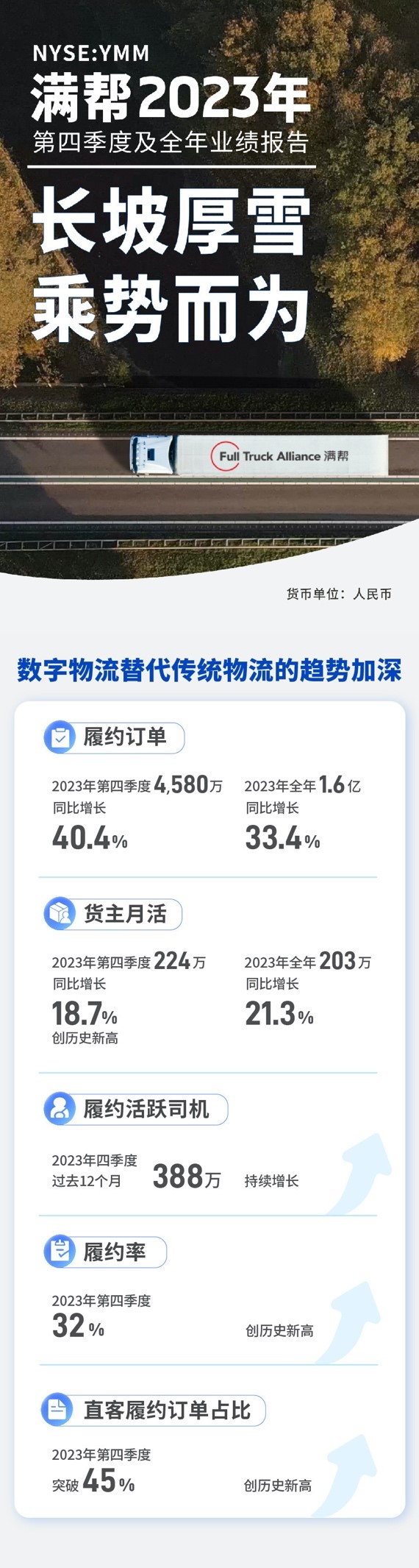 3月7日,数字货运平台满帮集团(YMM.US)于美股盘前发布了截至2023年12月31日的第四季度及全年业绩报告。
