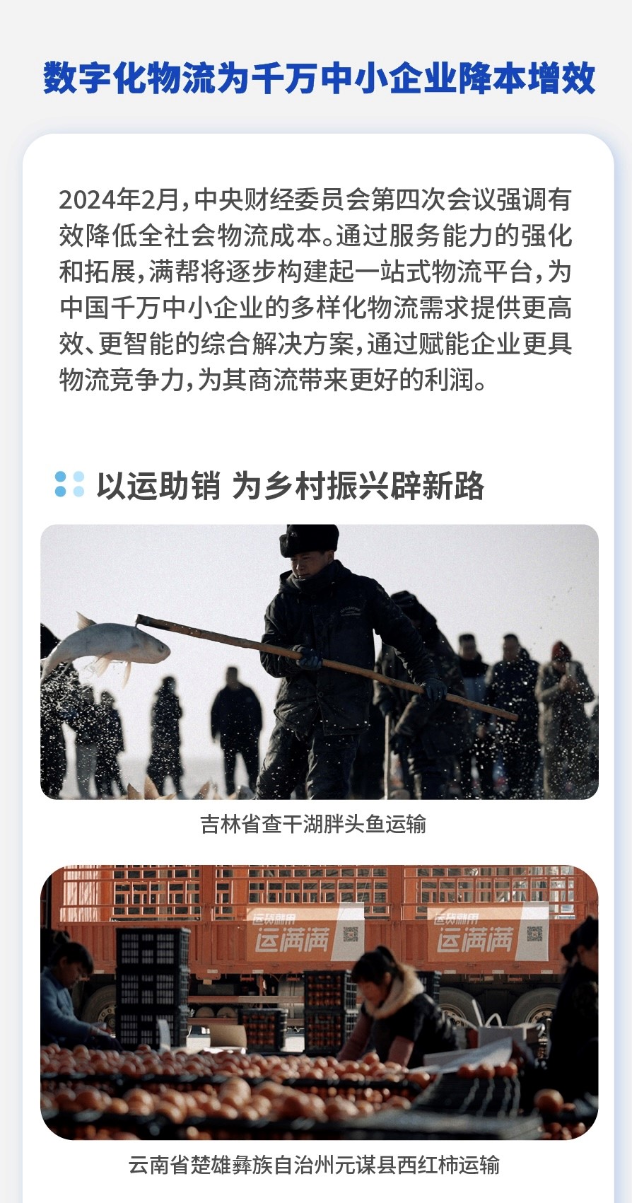 满帮管理层表示,2023年平台在顺应货运行业提效降本的大趋势,持续推动公路货运行业的线上化、数字化和智能化发展的同时,洞察中国千万中小企业对高质量、高灵活度、成本友好、服务全面型运力供给的迫切需求,着力构建一站式物流平台,通过打磨产品功能和提升运营效率,更好地以数字技术赋能中小企业用户,有效降低其物流环节的成本负担,从而为其商流带来更好的利润。