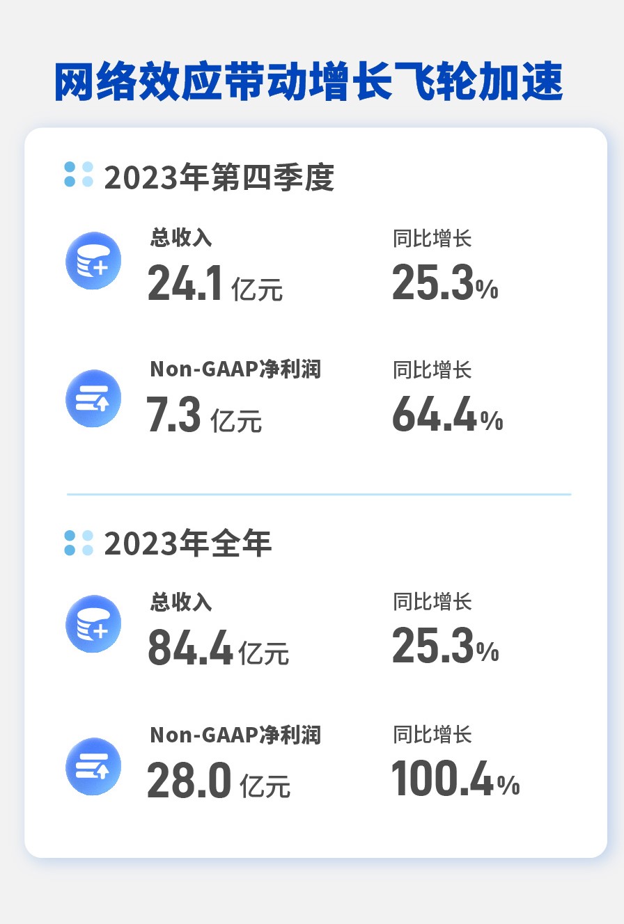 2023年第四季度,满帮实现营业收入24.1亿元(人民币,下同),同比增长25.3%,非美国会计准则下实现净利润7.3亿元,同比增长64.4%。