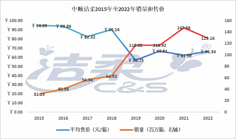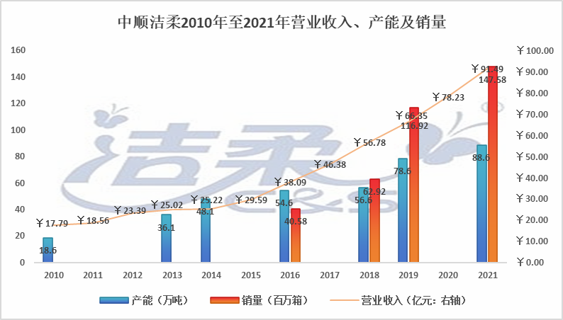 从相同口径的销量看:中顺洁柔销量从2016年的4058万箱增长至2021年的1.47亿箱(增幅2.64倍),同期营业收入从38.09亿元增长至91.49亿元(增幅为1.4倍)。