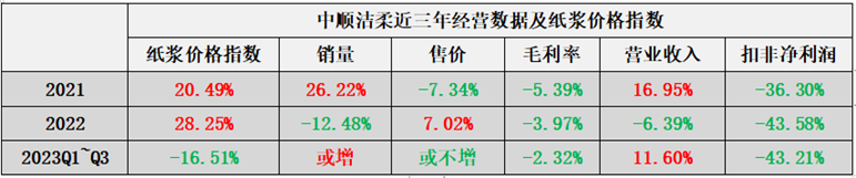 在上游涨价以及终端竞争加剧的双重打击下,中顺洁柔迎来了业绩拐点:(1)2021年,量增价减,增收不增利;(2)2022年,逆势涨价销量下滑,创下上市十二年以来首次营收利润双降;(3)涨价不理想,量或增长,增收不增利。