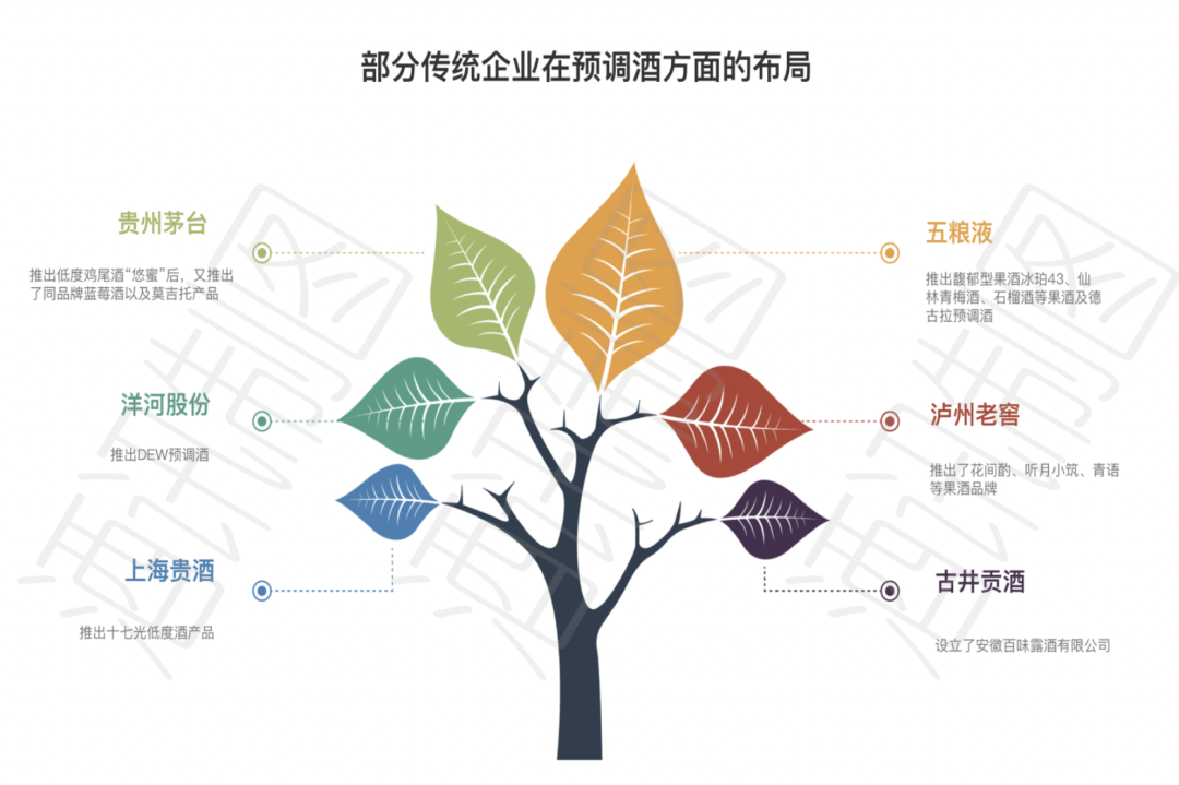 据酒讯不完全整理,茅台在推出低度鸡尾酒“悠蜜”后,又推出了同品牌蓝莓酒以及莫吉托产品;五粮液推出馥郁型果酒冰珀43、仙林青梅酒、石榴酒等果酒及德古拉预调酒;洋河推出DEW预调酒;泸州老窖则相继推出了花间酌、听月小筑、青语等果酒品牌;上海贵酒推出十七光低度酒产品;此外,古井贡酒设立了安徽百味露酒有限公司。