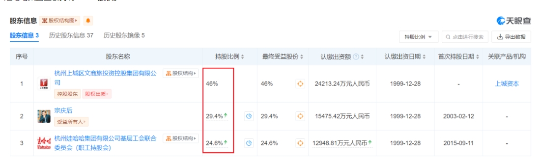 天眼查显示,娃哈哈集团最大股东是杭州上城区文商旅投资控股集团有限公司,持有46%股权,其背后就是杭州上城区国资委。宗庆后独自持有29.4%股权,娃哈哈集团工会持有24.6%股权。