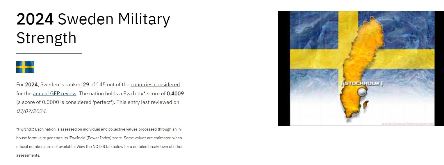 从军事实力来看,瑞典在“全球火力”网上排名第29名,该排名覆盖了全球145个国家和地区。