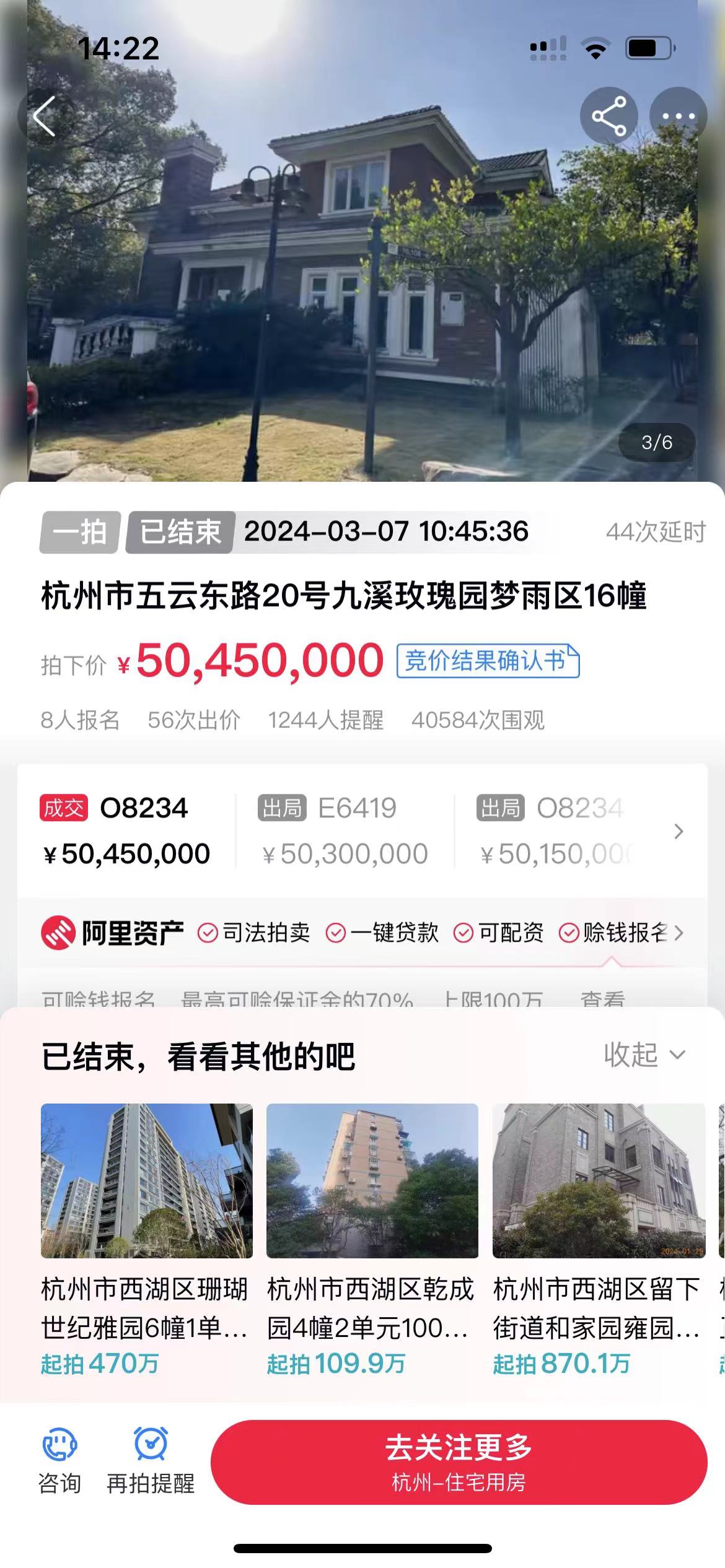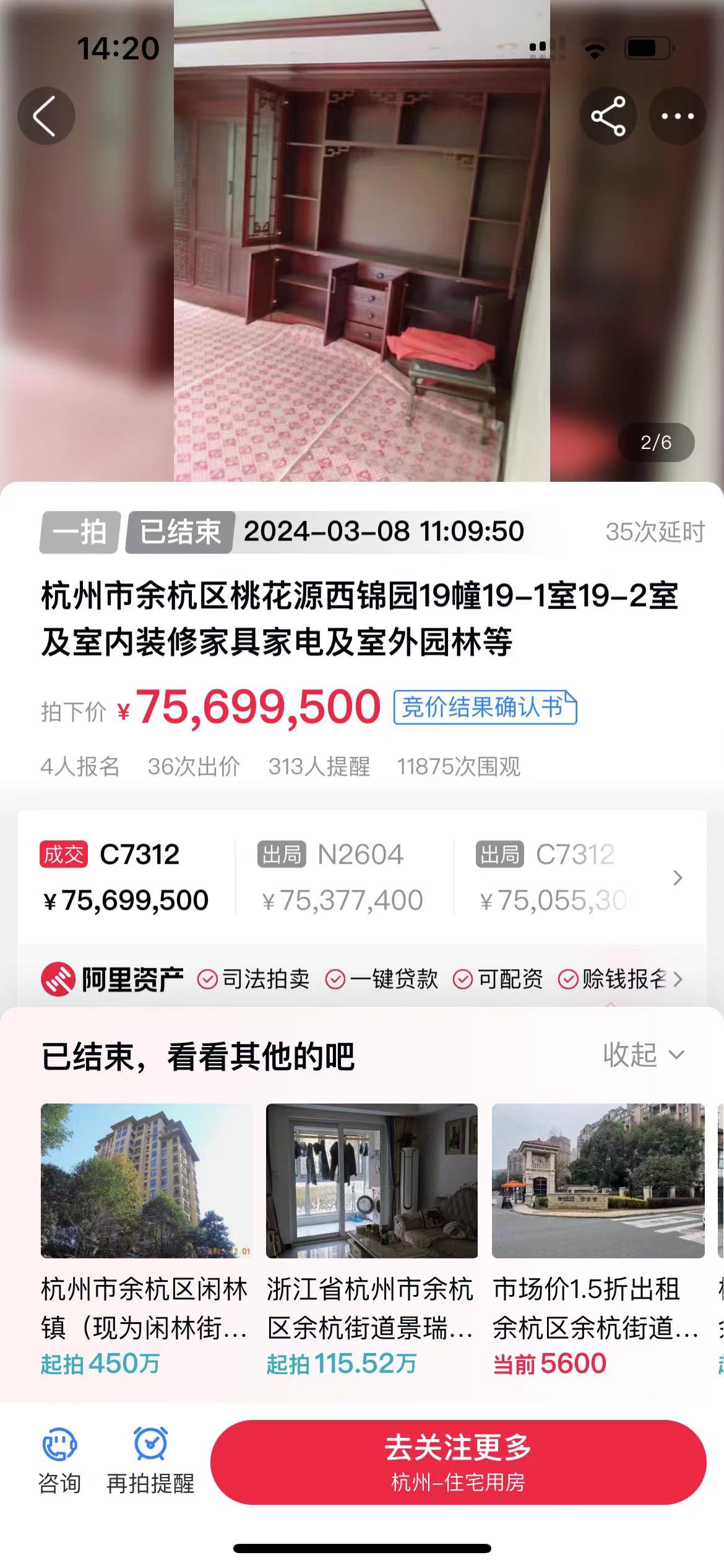 杭拍汇分析师毛章丽对界面新闻记者表示,去年10月杭州法拍房解除限购以来,杭州法拍市场逐渐有升温迹象,龙年春节后,法拍房的报名人数、围观人数以及成交结果上都有升温体现,稀缺性的高端豪宅别墅区更是如此。