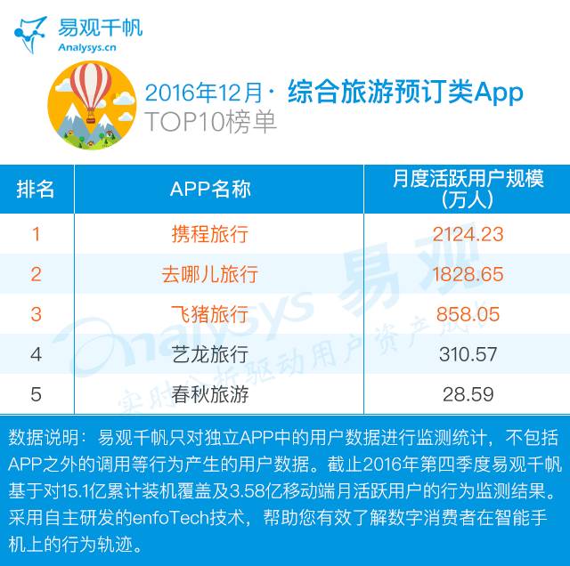 2016年12月综合旅游预订TOP5榜单中,携程旅行连续3个月保持活跃用户规模最高,月活达到2124.23万;去哪儿旅行月活环比小幅增长,达到1828.65万;阿里旅行10月底更名为飞猪旅行,11月月活环比下降,12月回升至全年最高水平,达到858.05万。