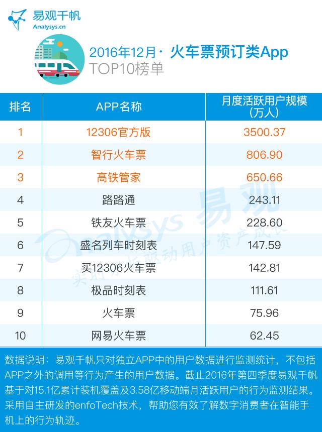 Analysys易观分析认为,12306独占火车票分销渠道的现状短期内不会改变,作为市场化运营的其他火车票预订App,需要基于用户出行场景落实服务体验,并结合用户属性的大数据分析,针对用户个性化需求搭建交易场景,提供服务,从而提升服务溢价,拓展盈利空间。