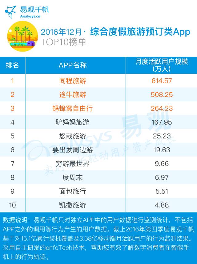 度假旅游领域受到元旦和春节度假双重因素影响,在元旦出行方面,中长途国内游和出境游预订通常在2016年11月或更早完成订单交易,因此中短途度假出行是影响12月数据表现的主要因素,因此要出发周边游和度周末等周边游App月活环比增幅突出,分别达到62.79%和155.70%,12月月活分别为19.63万和6.97万;春节出行方面,春节度假旅游需求近年来不断释放,越来越多居民选择春节期间进行南向家庭度假旅游,推高12月综合度假旅游预订类App数据。从TOP10榜单来看,同程旅游、途牛旅游、蚂蜂窝自由行和驴妈妈旅游用户活跃程度较高,用户规模居于前列,整体小幅增长。