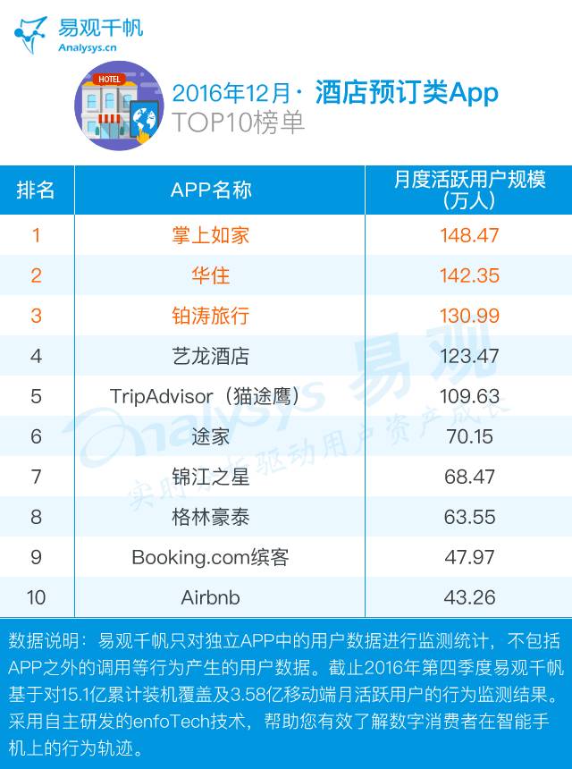 值得注意的是,榜单中艺龙酒店增幅达到32.64%,反映出艺龙作为携程系下针对年轻人群的酒店预订产品,用户细分明确,同时,酒店预付产品“转让卖钱”等创新功能体现运营上的灵活性,与旅游人群个性化出行的发展趋势更加匹配。