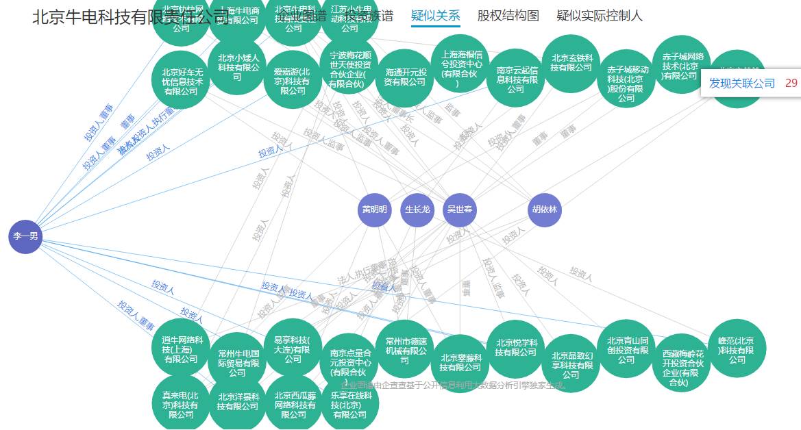 上边的两张图为据企查查公示的牛电科技的股权结构与疑似关系,从中我们可以看出目前李一男依旧是牛电科技最大的股东,占股份额为68.4211%,而与李一男关联的公司还有十几家,由此我们可以得到的信息就是,当李一男出狱的时候,他依旧可以控制牛电科技,带领牛电科技继续发展。