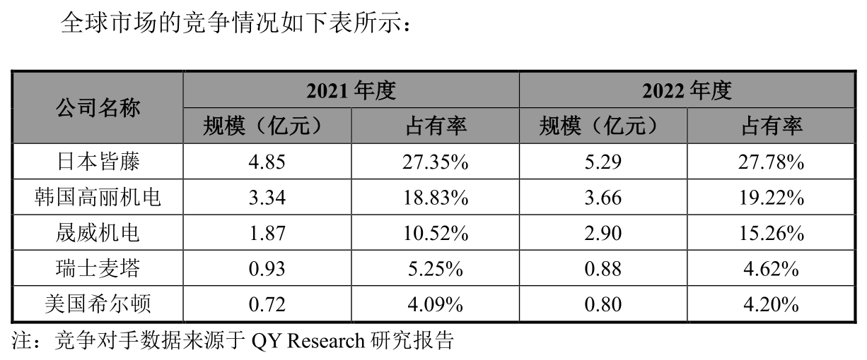 这一方面说明公司在行业中具有一定竞争力,同时市场竞争的激烈也可想而知。根据晟威机电自己预测,以2022年公司国内市占率39.17%为例,若公司国内市场份额下降5个百分点,营业收入和净利润将下降11.21%;若公司国内市场份额下降10个百分点,营业收入和净利润将下降22.43%。