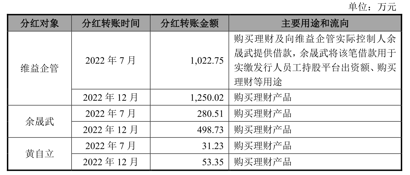 根据晟威机电的回应,5000万元的分红是为了回报股东,与此同时,晟威机电的股东及实际控制人维益企管、余晟武、黄自立、成婷欠付晟威机电资金占用款1722.37万元。这次的分红也是为了解控股股东、实际控制人资金占用问题。那么在扣除占用的资金之后,实际发放的分红买了理财产品等。