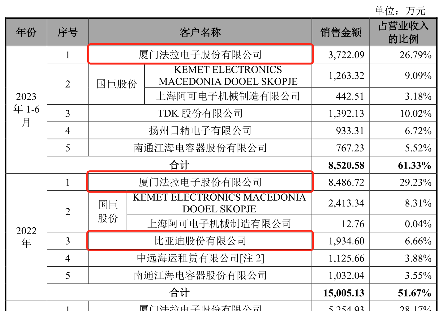 公司2023年上半年前五客户合计的销售金额占营业收入比例61.33%,2020年至2022年的比例分别为49.05%、55%、51.67%,可见公司客户集中度较高。这其中,法拉电子(600563.SH)为第一大客户,2023年上半年比例为26.79%。法拉电子在2020年时的销售金额为229.26万元,到2023年上半年飙涨至3722.09万元。