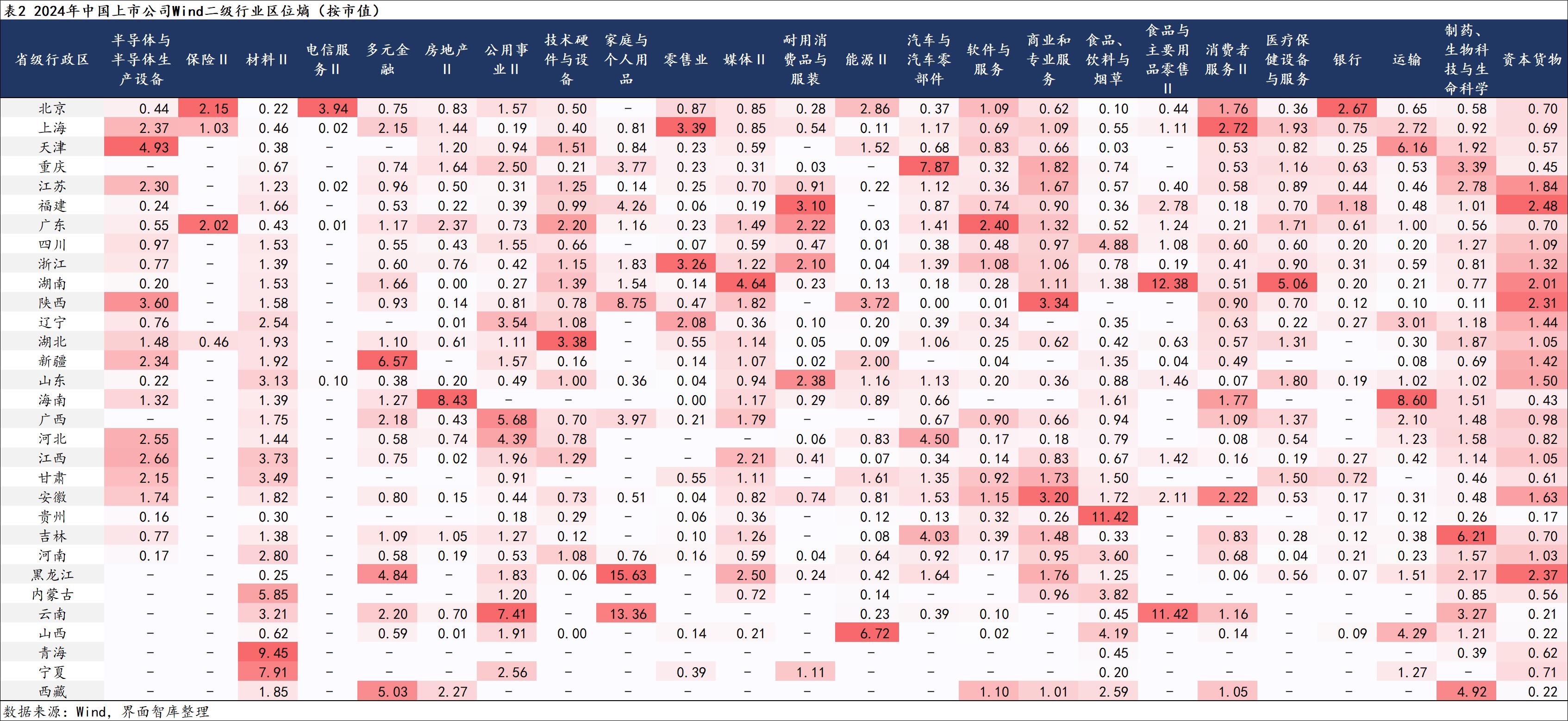 北京和湖南均拥有三个“市值区位熵”排名第一的行业,北京包括电信服务II(3.94),银行(2.67),保险II(2.15),中国三大电信运营商等大型央企对相关行业“规模集聚度”的贡献较为显著,以及由于多数的头部上市银行、保险公司大多集中在北京,导致银行和保险业的“规模集聚度”也较为突出;湖南除了食品与主要用品零售II行业外,还包括医疗保健设备与服务(5.06),媒体II(4.64)。