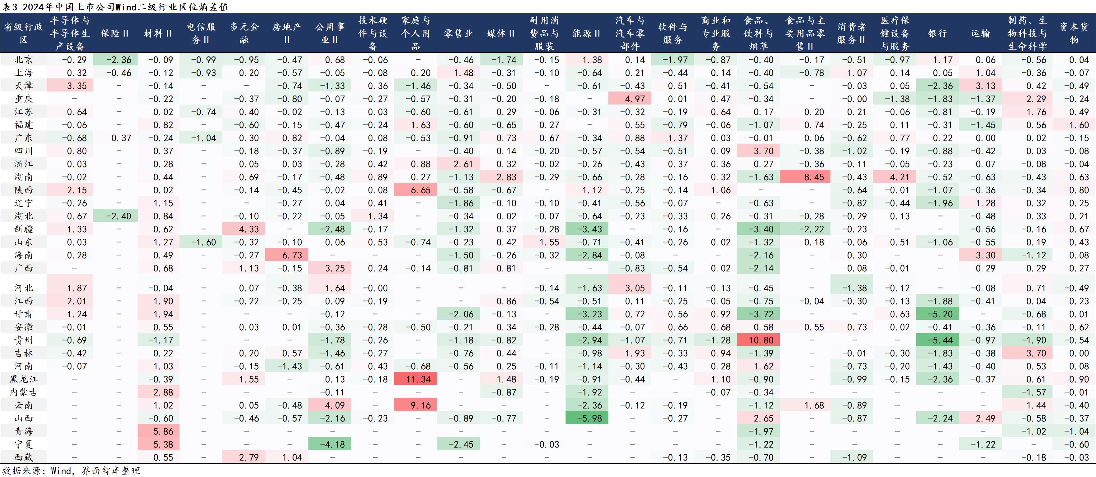 通过对数据的观察,我们发现北京的电信服务II、保险II,福建的耐用消费品与服装,山西能源II,重庆的汽车与汽车零部件,海南的运输,青海的材料II的“数量区位熵”和“市值区位熵”均列第一,表明这些地区的这些行业不仅具有数量优势,还具有规模优势。