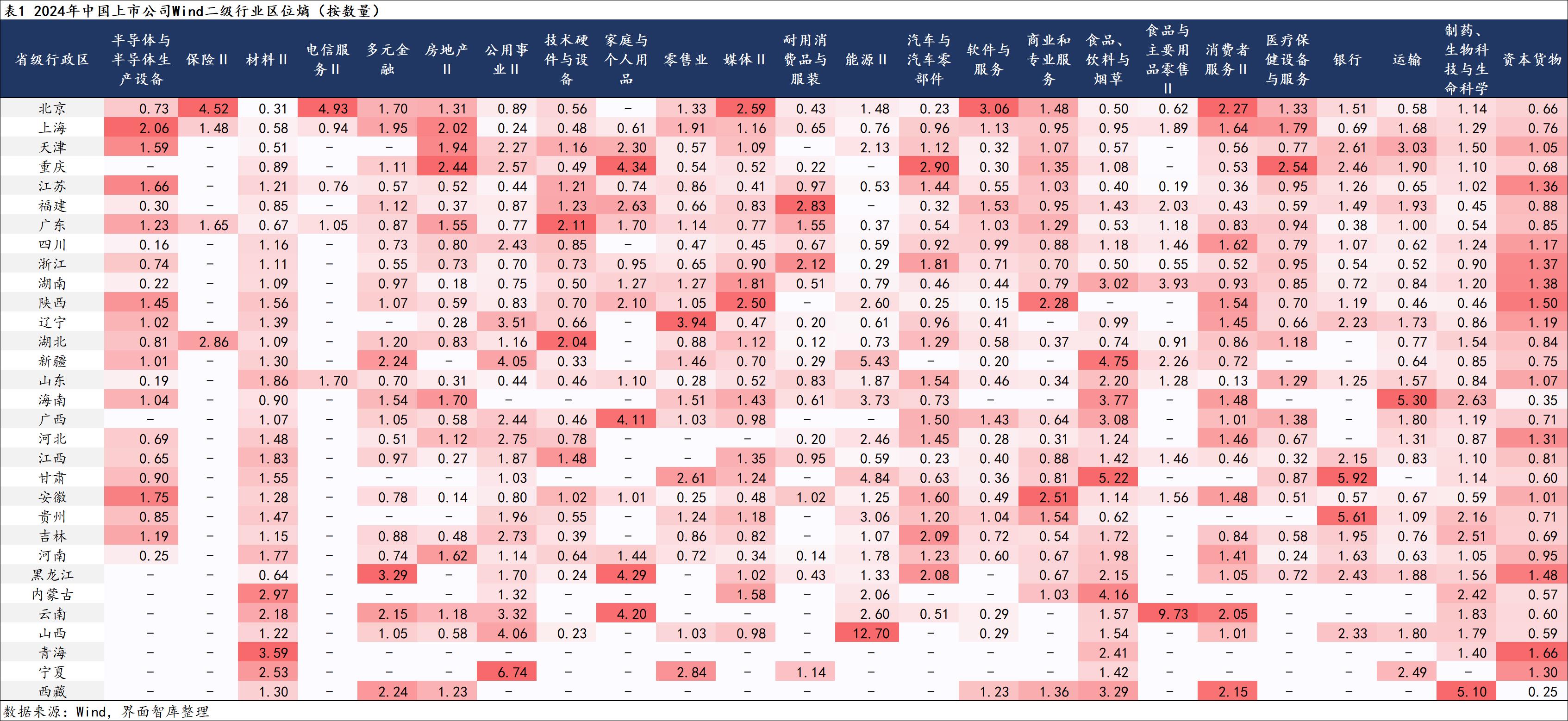 在界面智库推出的“上市公司区域图鉴”系列报告的第二篇中,我们讨论了Wind二级行业在31省市上市公司中的数量占比及市值占比情况。在系列报告的第三篇中,我们将进一步探究从上市公司角度观察的各省市产业集聚情况,进而找出各省市在全国具有一定优势地位的产业,由此我们引入了区位熵这一指标。