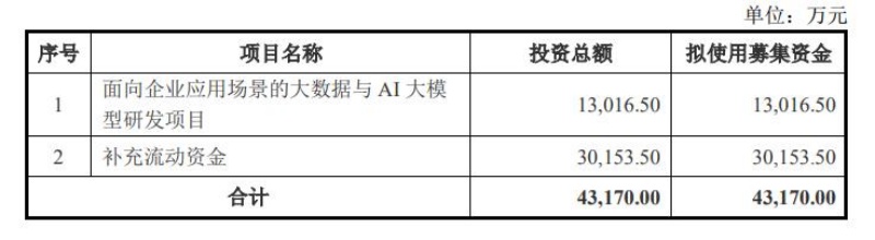 根据发行预案,除了补充流动资金,本次发行的募集资金将用于面向企业应用场景的大数据与AI大模型研发项目。