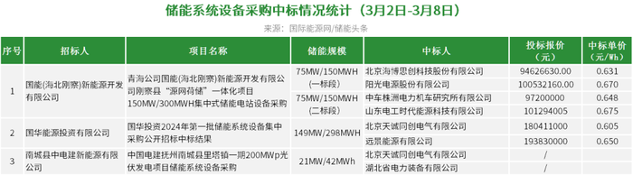 国家能源集团有2个储能系统开标,总规模是299MW/598MWh;青海公司国能(海北刚察)新能源开发有限公司刚察县“源网荷储”一体化项目150MW/300MWH集中式储能电站设备采购公开招标中标候选人公示发布。