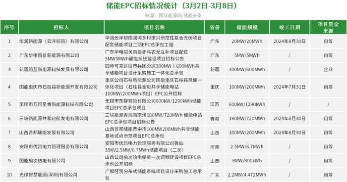 据国际能源网/储能头条(微信号:chuneng365)统计,本周华润集团、三峡集团、华电、国家能源集团等发布了10个储能EPC招标项目,招标规模为316.536MW/741.536MWh。项目位于广东、新疆、青海、山西、重庆等地。