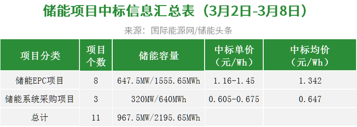 据国际能源网/储能头条(微信号:chuneng365)不完全统计,本周共有储能系统EPC项目为8个,储能系统采购项目开标3个,总开标装机容量为967.5MW/2195.65MWh。