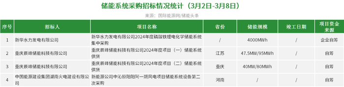 本周,新华水力发电有限公司发布新华水力发电有限公司2024年度磷酸铁锂电化学储能系统集中采购公开招标公告。此次招标规模4000MWh。