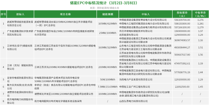 中国能建发布武威智慧绿能泗水镇105MW/420MWh独立共享储能项目(一期)EPC总承包采购中标候选人公示。中标候选人第一名为中国能源建设集团甘肃省电力设计院有限公司,报价为536109700元,折合单价1.276元/Wh;中标候选人第二名为中国电力工程顾问集团西北电力设计院有限公司,报价为538133300元,折合单价1.281元/Wh;中标候选人第三名为中国能源建设集团山西省电力勘测设计院有限公司,报价为537266100元,折合单价1.279元/Wh。