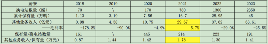 其中,2021年标黄的数据需要调整,当年其他业务收入包括6亿元~10亿元的双积分收入,其调整后的毛利率在-14%~-28%之间,调整后“其他业务收入/保有量”在1.18万元~1.42万元之间。