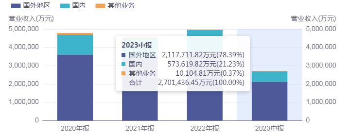 分地区看,海外业务在公司业务经营中占主导地位,营收占比多年来保持在70%左右。