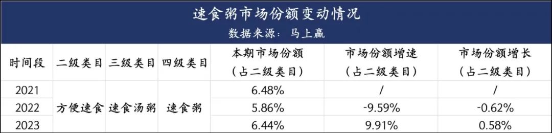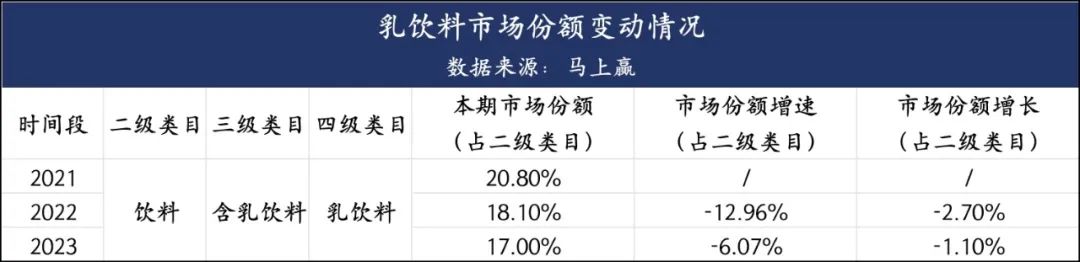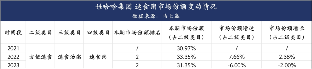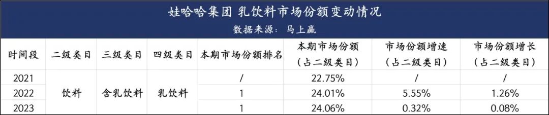 基于马上赢数据监测网络中的数据,我们拉取了2021-2023年,三年期间娃哈哈销售额占比较高的乳饮料类目、速食粥类目的市场份额变动情况: