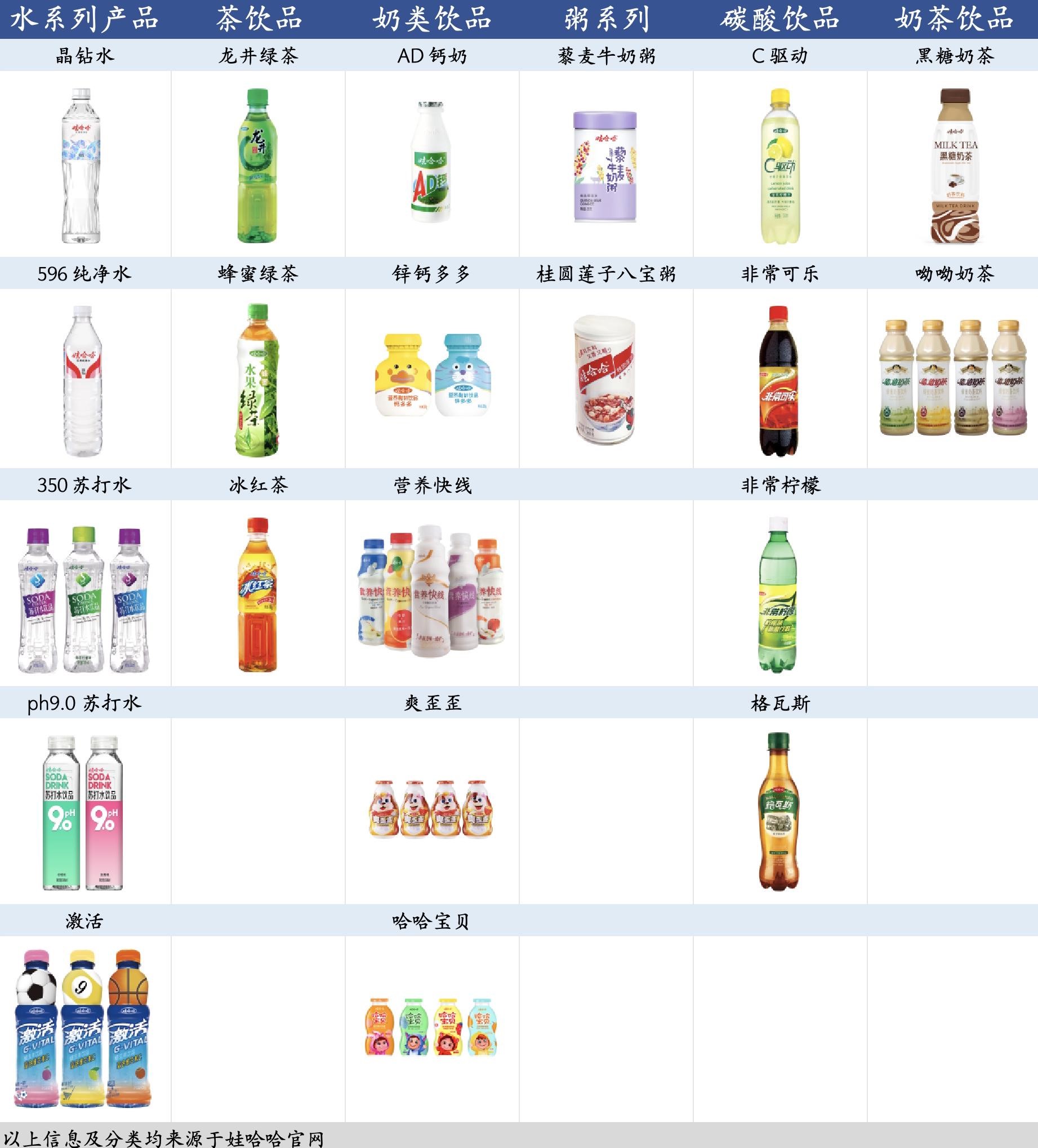 马上赢情报站根据娃哈哈官网各分类中的产品,梳理了如下表单: