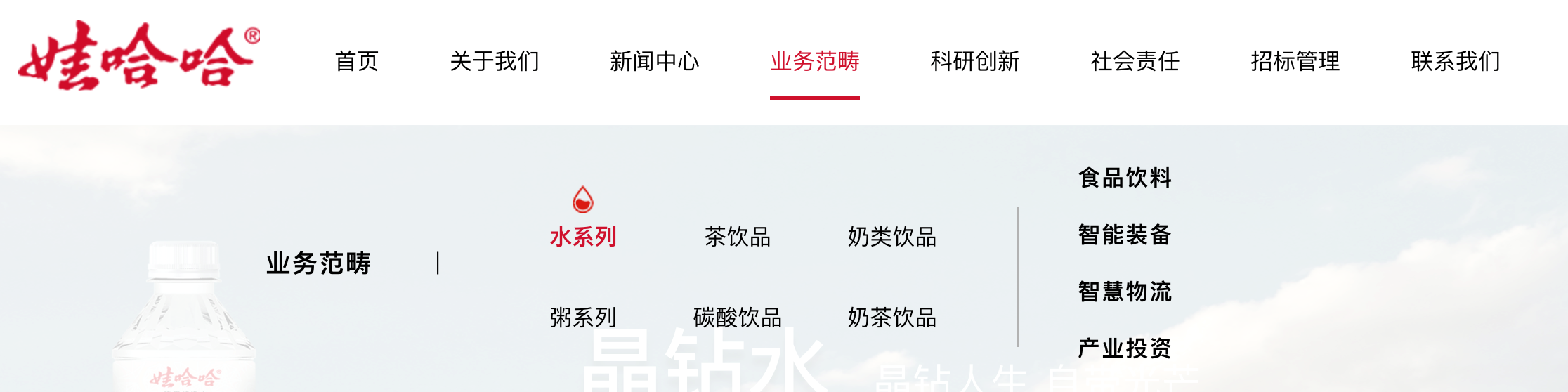 根据娃哈哈官网中业务范畴的描述,目前娃哈哈集团主要包含食品饮料、智能装备、智慧物流、产业投资等业务板块。在最受人关注的食品饮料板块中,官网通过六大类产品进行分类,分别是:水系列、茶饮品系列、奶类饮品系列、粥系列、碳酸饮品系列、奶茶饮品系列。