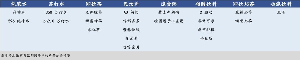基于马上赢零售监测网络中的产品分类标准,我们将这些产品映射于马上赢的类目中: